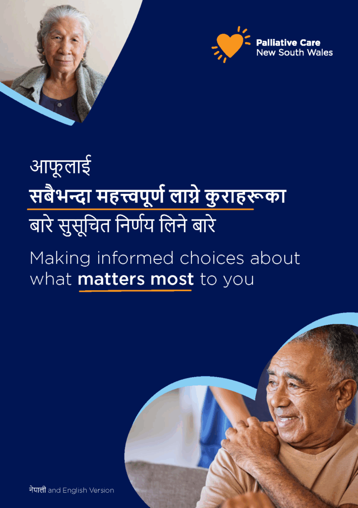 Palliative Care NSW’s resource Understanding Palliative Care: Making Informed Choices About What Matters Most to You provides key information on palliative care in Nepali and English.